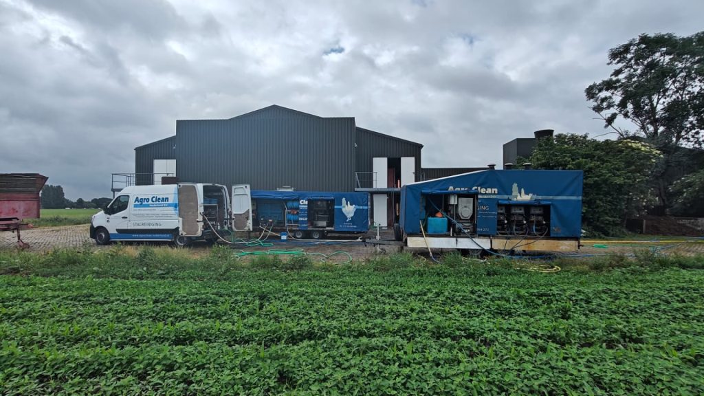 Deze is uitgerust met een stroomaggregaat, 4 warmwater hogedruk reinigers, 1 lagedruk spoelpomp, voorraadtank van 2.000 liter, 800 meter hogedruk slang en diverse andere slangen, koppelingen, lanzen, steigermaterialen, etc. Hierdoor kunnen de grootste stallen binnen 1 week door ons gereinigd worden.
